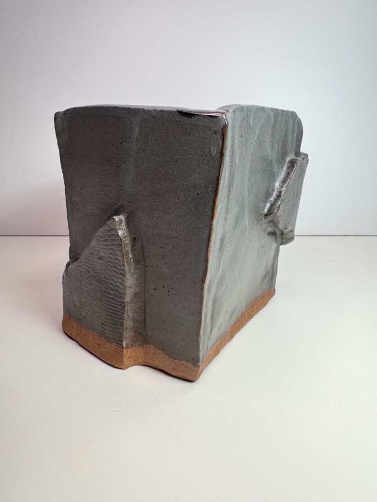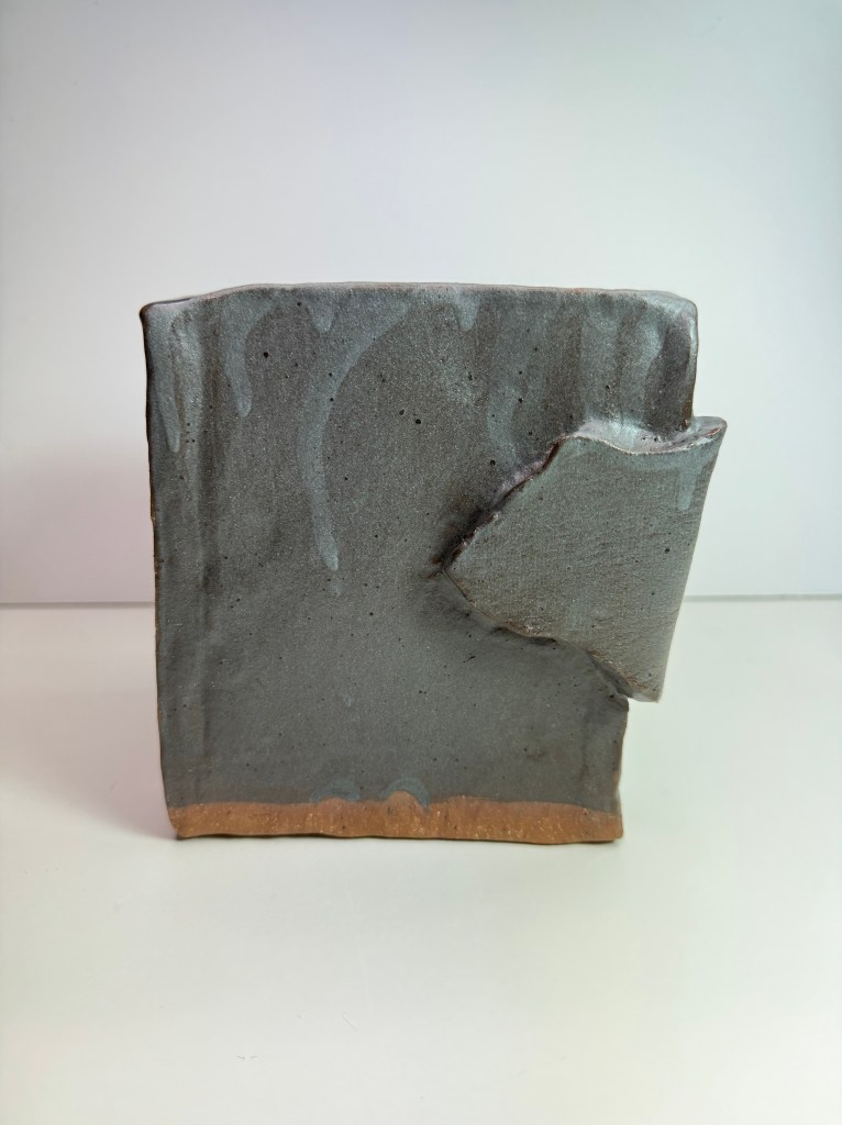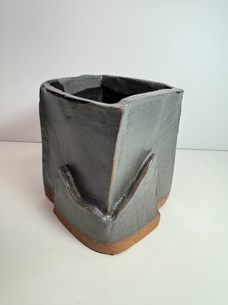 I made this vase for my cousin in Chicago. I experimented with techniques such as hand building a square structure, as well as adding on clay that I had textured with found material – netting from a random product from the local Asian grocery store.