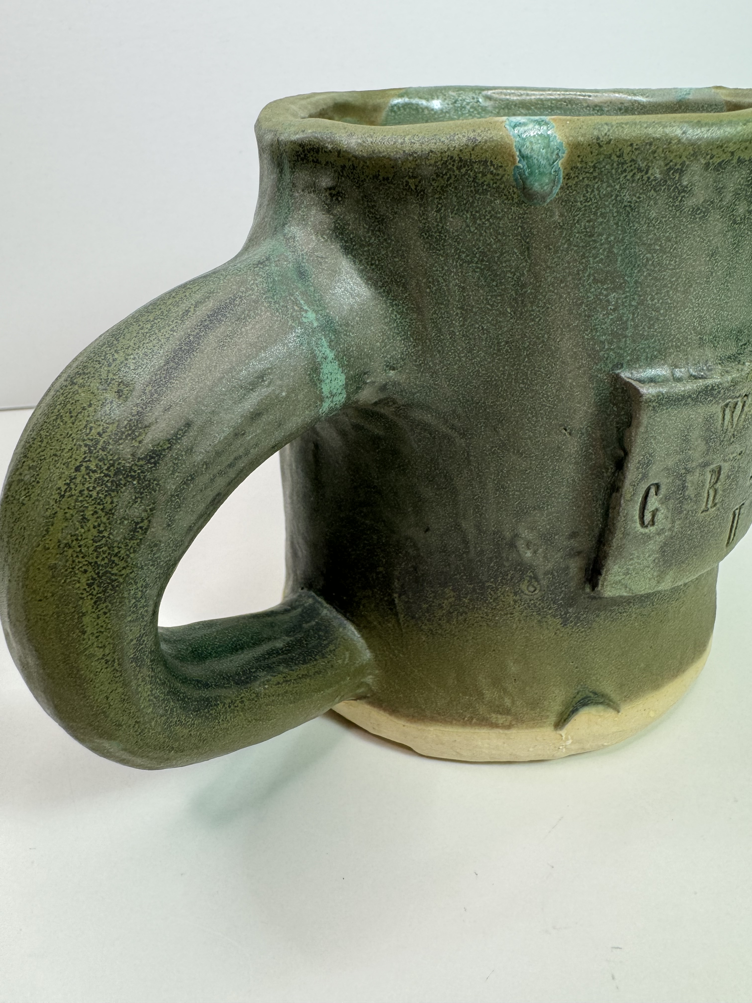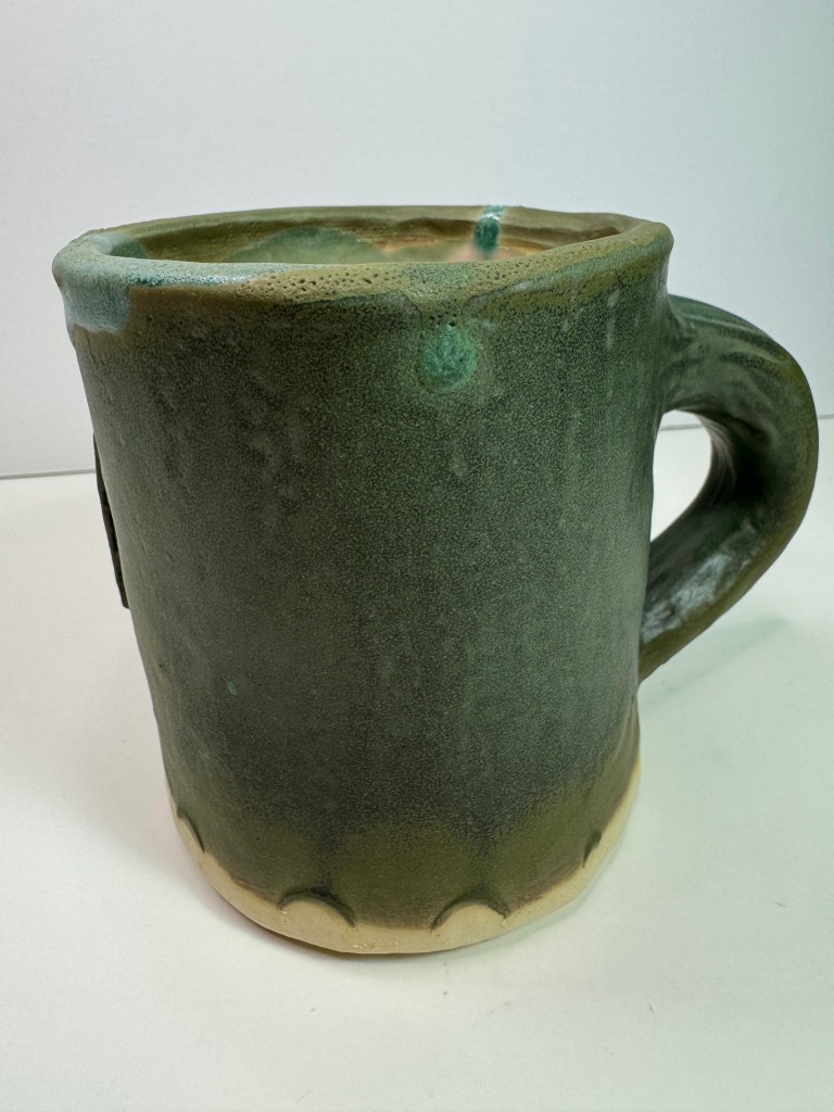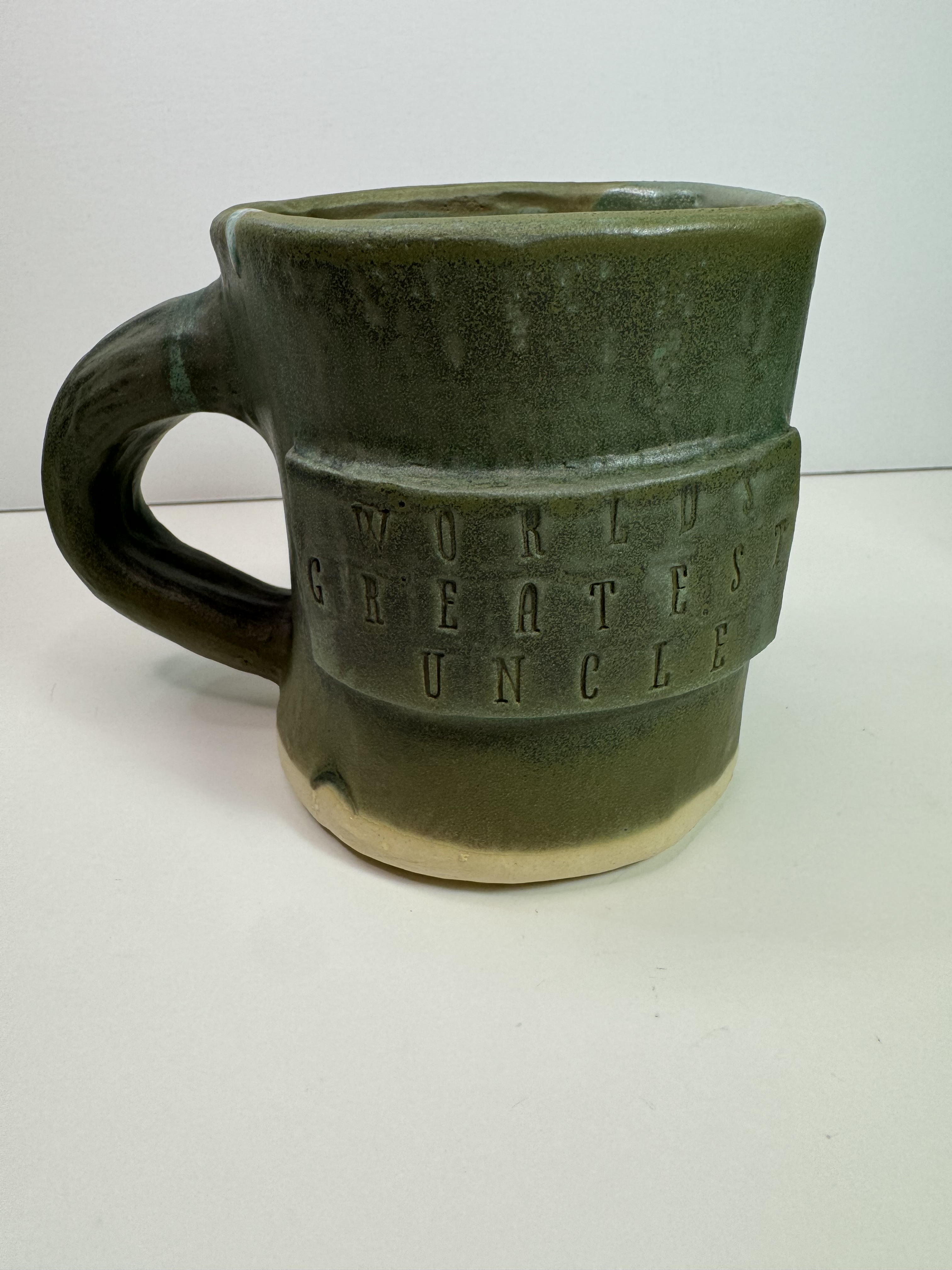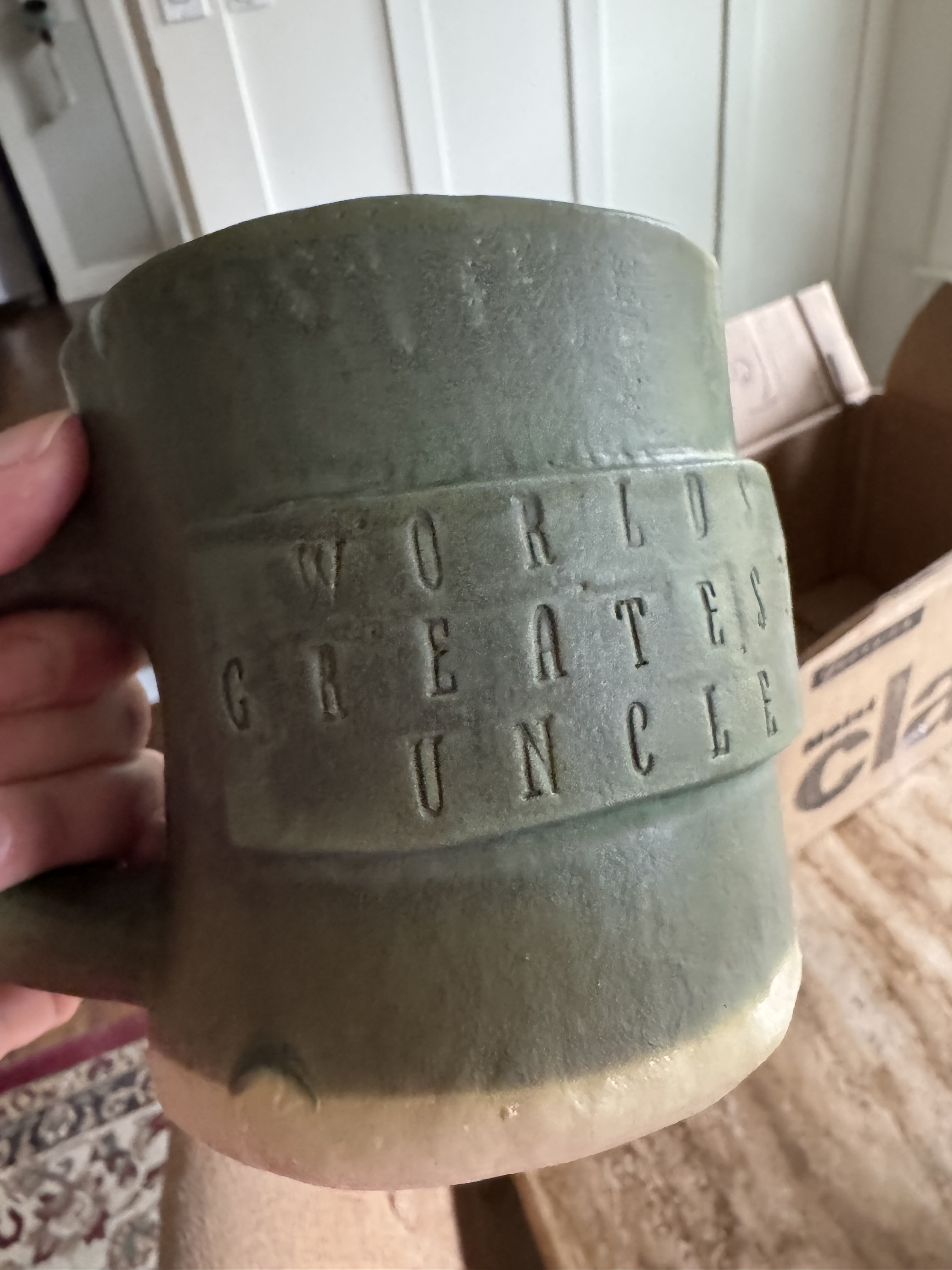 I made this mug for my uncle. It is a heavy beast. Not for the faint of heart. I hand-built it using clay I rolled with a rolling pin. I lettered the piece using stamps I bought from a dollar store. I really love that you can pick up stuff you found around the house to make beautiful ceramic pieces that will be beloved for years.